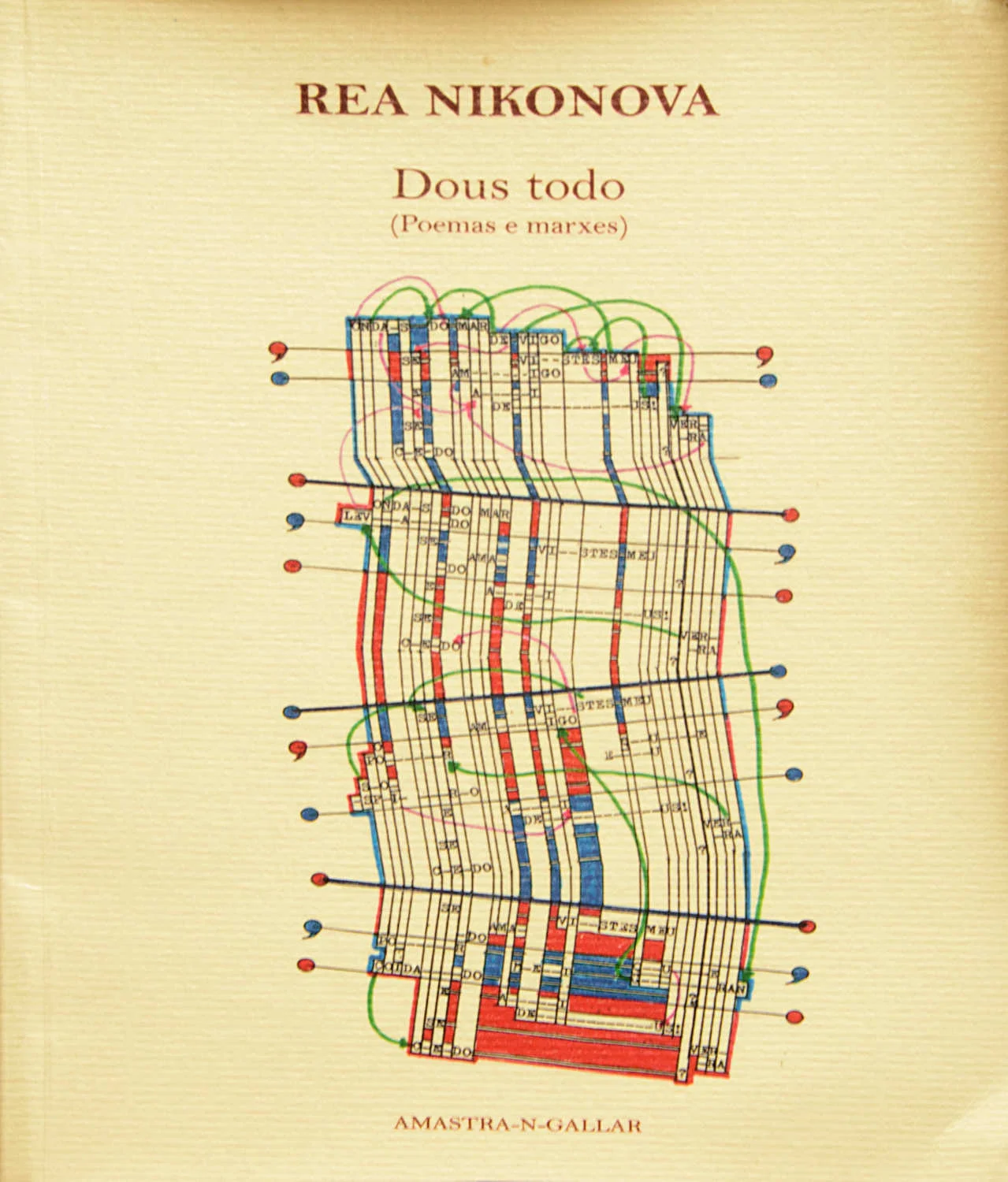 Book of Ry Nikonova's poetry, both visual and verbal, of years 1963-1999, translated to Spanish (Catalan?) language by Irina Stepanova. It also has some articles by Ry Nikonova, also translated. This book was published in Santiago de Compostela, Spain in 2001.