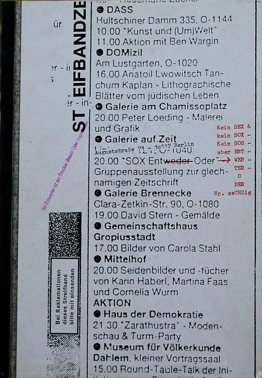 Catalogue of exhibition which took place across Germany, apparently in Berlin, Leipzig and Stuttgart among other places, features original work by Serge Segay. Published in Berlin circa 1996 (they do not have formal impressum unfortunately).
