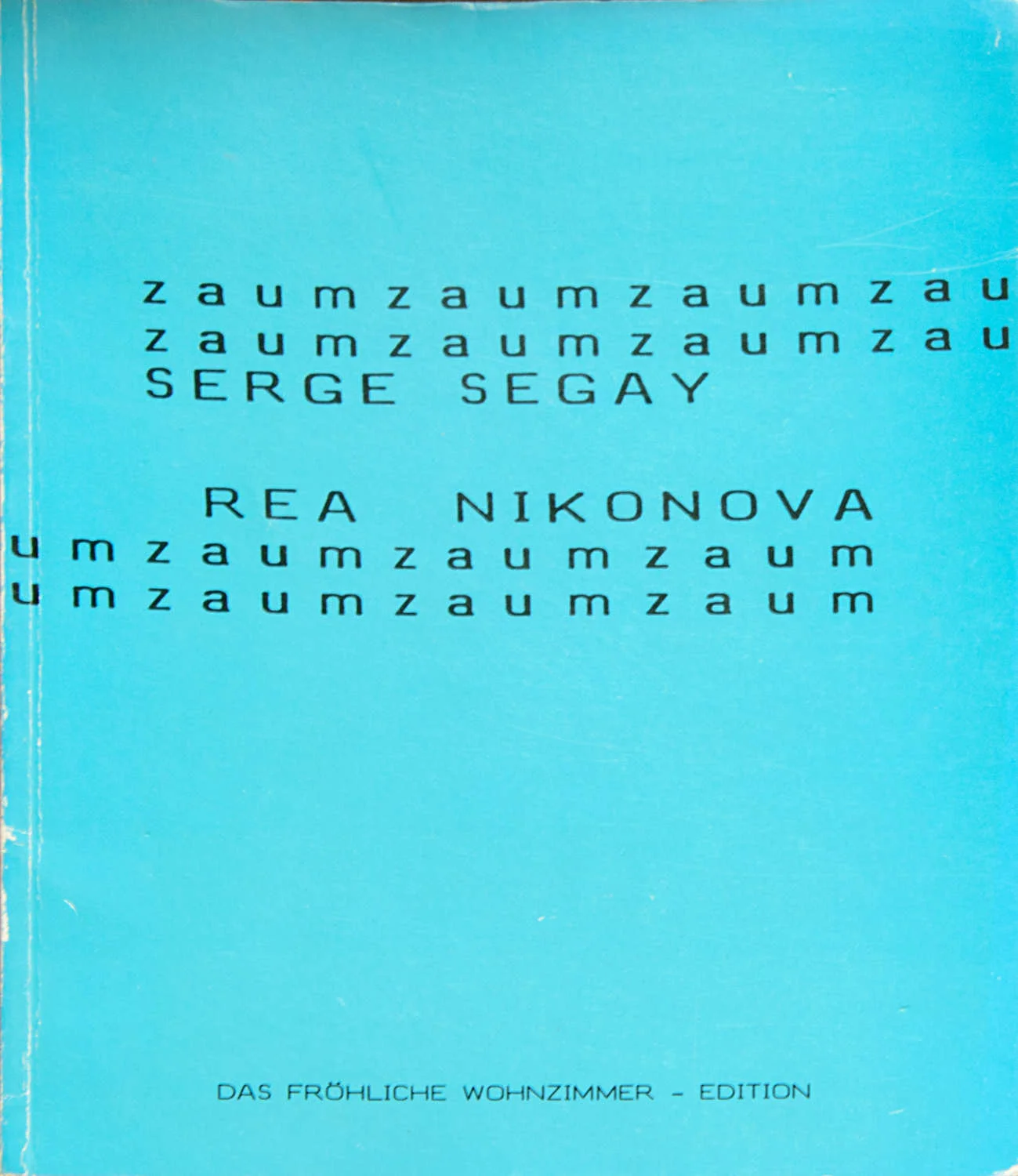 This book contains visual poetry by Ry Nikonova and Serge Segay. It was published in Wien in 1990. It also has short biography synopsis at the back, in German.